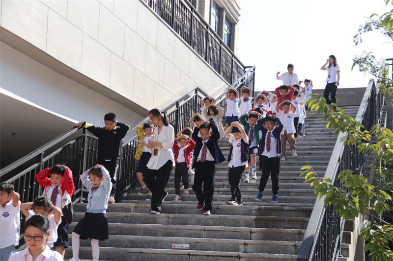 之后在凄厲的空襲警報聲中,大家立即抱頭蹲下或快速就近躲避,以防傷害。解除警報悠悠響起后,班級教師按照預定位置集中整隊,清點學生人數(shù),匯報疏散情況,演練順利完成。