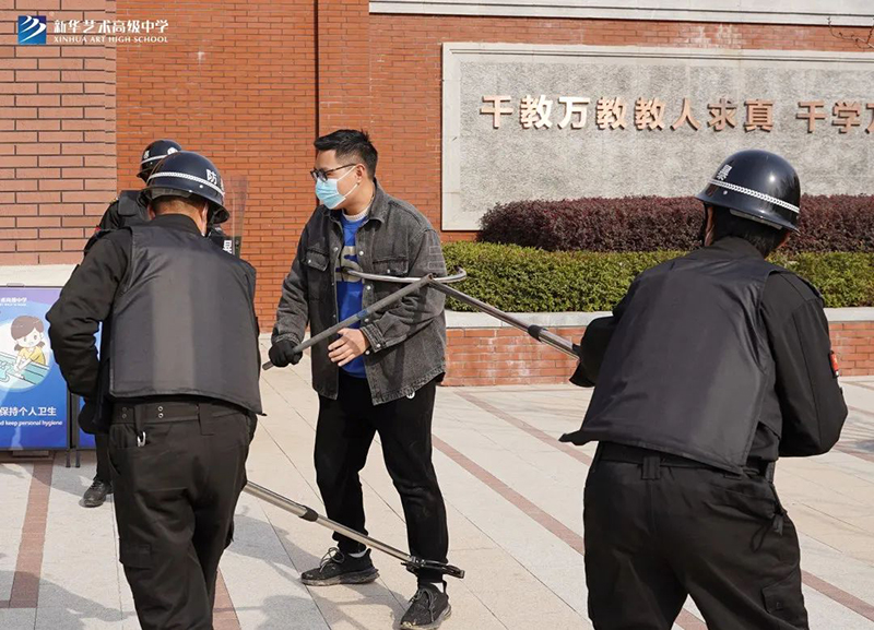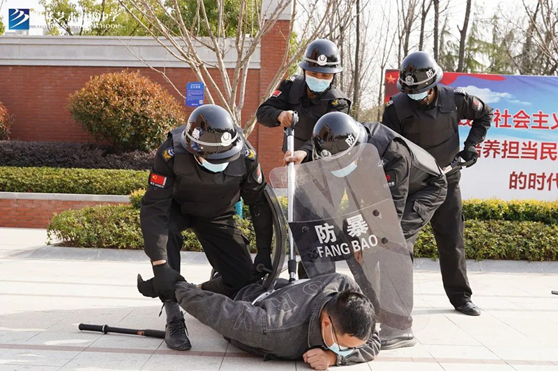 應(yīng)急防暴組人員快速到達現(xiàn)場,手持警棍、鋼叉等迅速將施暴的“歹徒”團團圍住,成功將“歹徒”控制并帶離現(xiàn)場。確認現(xiàn)場安全后,廣播通知警報解除,學生恢復(fù)正常活動。