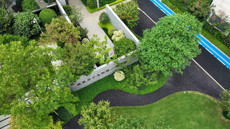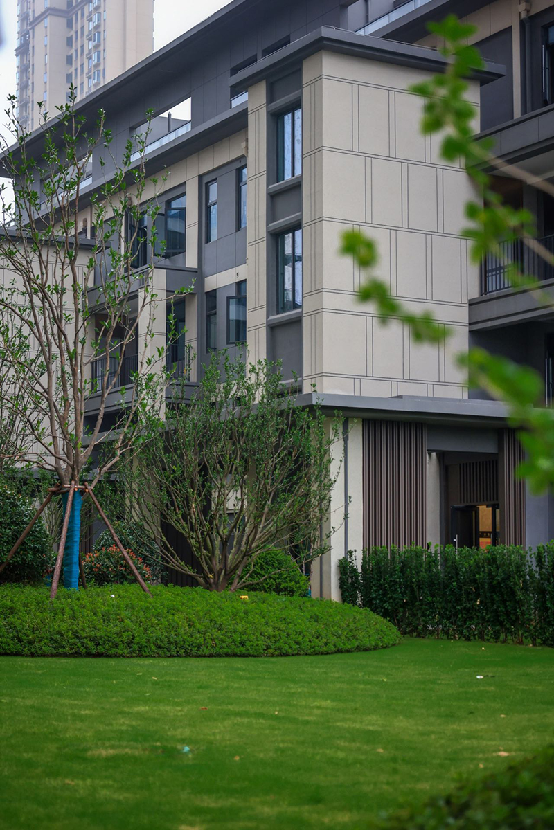 從方寸間的圖紙到漸露新姿的建筑,有序營造出歷久彌新的時(shí)代美學(xué)。簡約時(shí)尚的立面線條呈現(xiàn)建筑的挺拔感,于自然濃蔭中安靜掩映,盡顯清幽寧和。