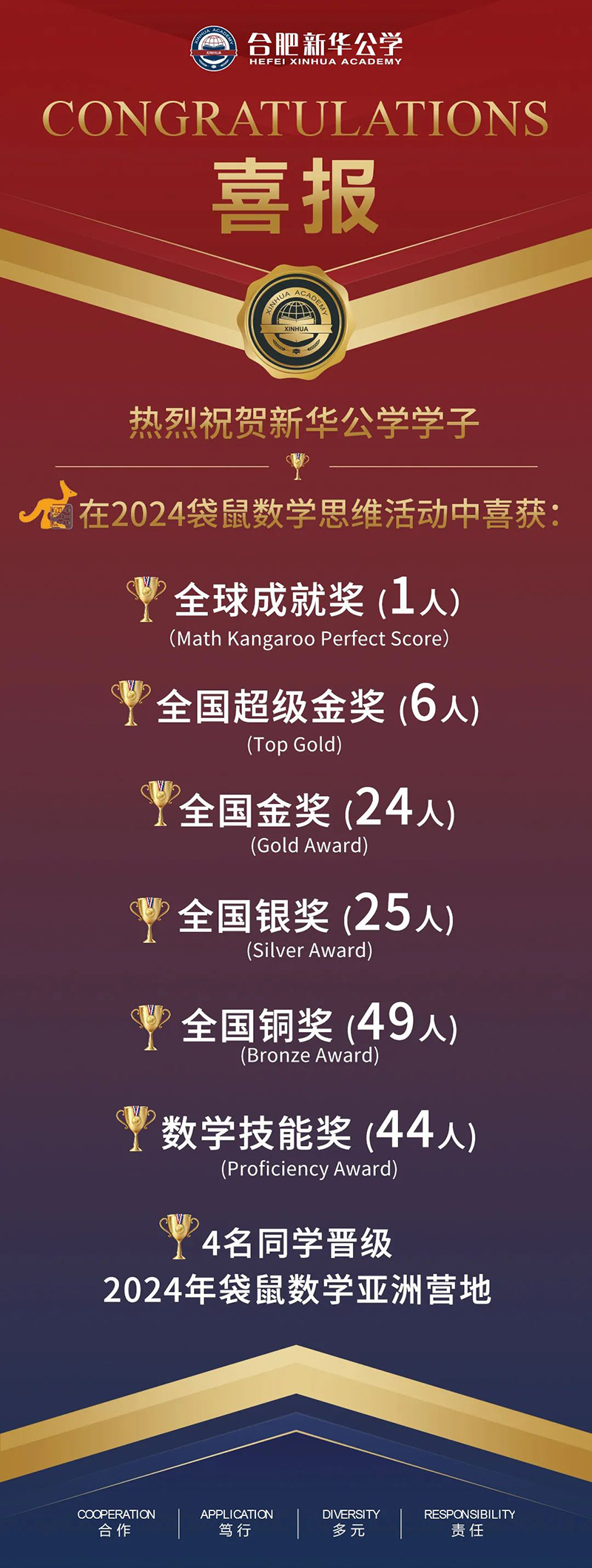 最后,再次祝賀所有獲獎(jiǎng)同學(xué)與參賽同學(xué)!對(duì)數(shù)學(xué)的興趣只是起點(diǎn),而在自己感興趣的領(lǐng)域深入鉆研、甚至選擇了高出自身年級(jí)的難度等級(jí)來(lái)挑戰(zhàn)自己,這樣的自信力與勇氣更為可貴!我們希望參賽的每一位新華學(xué)子,都能因這樣亮眼的成績(jī)而獲得成就感,在以后的學(xué)習(xí)中充滿動(dòng)力、再創(chuàng)佳績(jī)!